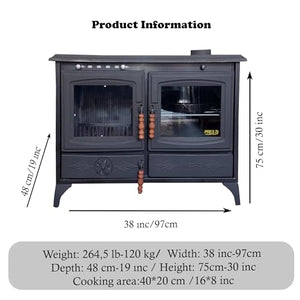 - STOVE DIMENSIONS: 30"(H) x 38"(W) x 19"(L) | Weight: 265 lbs | | !!! STOVE PIPES ARE NOT INCLUDED TO PACKAGE !!! | CHIMNEY DIAMETER CONVERTER IS FREE AS A GIFT!!!